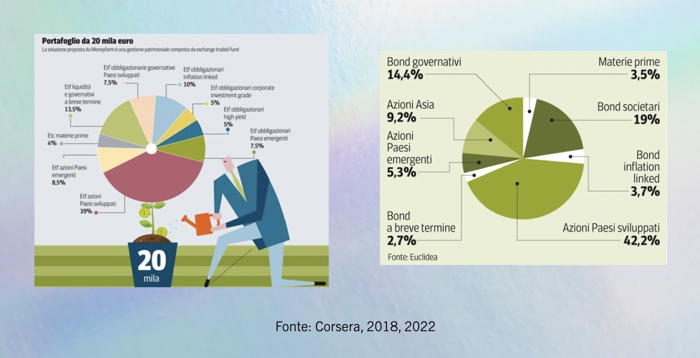 Nel “glossario” finanziario, solitamente, riferendosi al portafoglio di investimenti (come se fosse un “grosso portadocumenti”) contenente un insieme di asset (tanti e diversi: denaro in un conto deposito o in certificati di deposito, immobili, azioni, obbligazioni, ETF, fondi comuni d’investimento, criptovalute etc.) acquistati o in cui si intende investire per generare reddito o apprezzamento del capitale. Ed ecco che oltre a considerazioni di natura temporale e/o connesse alla durata si ritrova il concetto di rischio e di tolleranza al rischio, anche a seconda dei diversi Paesi e/o della tipologia di prodotti (materie prime, energia, etc.). Un adagio molto impiegato in finanza è: “…più lungo è l’orizzonte temporale e più arditamente si può agire”. In altri termini, la composizione del portafoglio dipenderà dalla quantità di rischio che si è disposti ad assumere attraverso l’investimento nei diversi asset e dal tempo per il quale si desidera investire. Il mix delle varie tipologie di investimento (o classi di attività) permette di distribuire il rischio e massimizzare il potenziale, connesso all’opportunità di ottenere buoni rendimenti futuri, proprio perché ciascuna classe di attività ha caratteristiche e rischi diversi, e combinandole insieme si può ottenere la cosiddetta diversificazione del portafoglio reputata più efficace.
