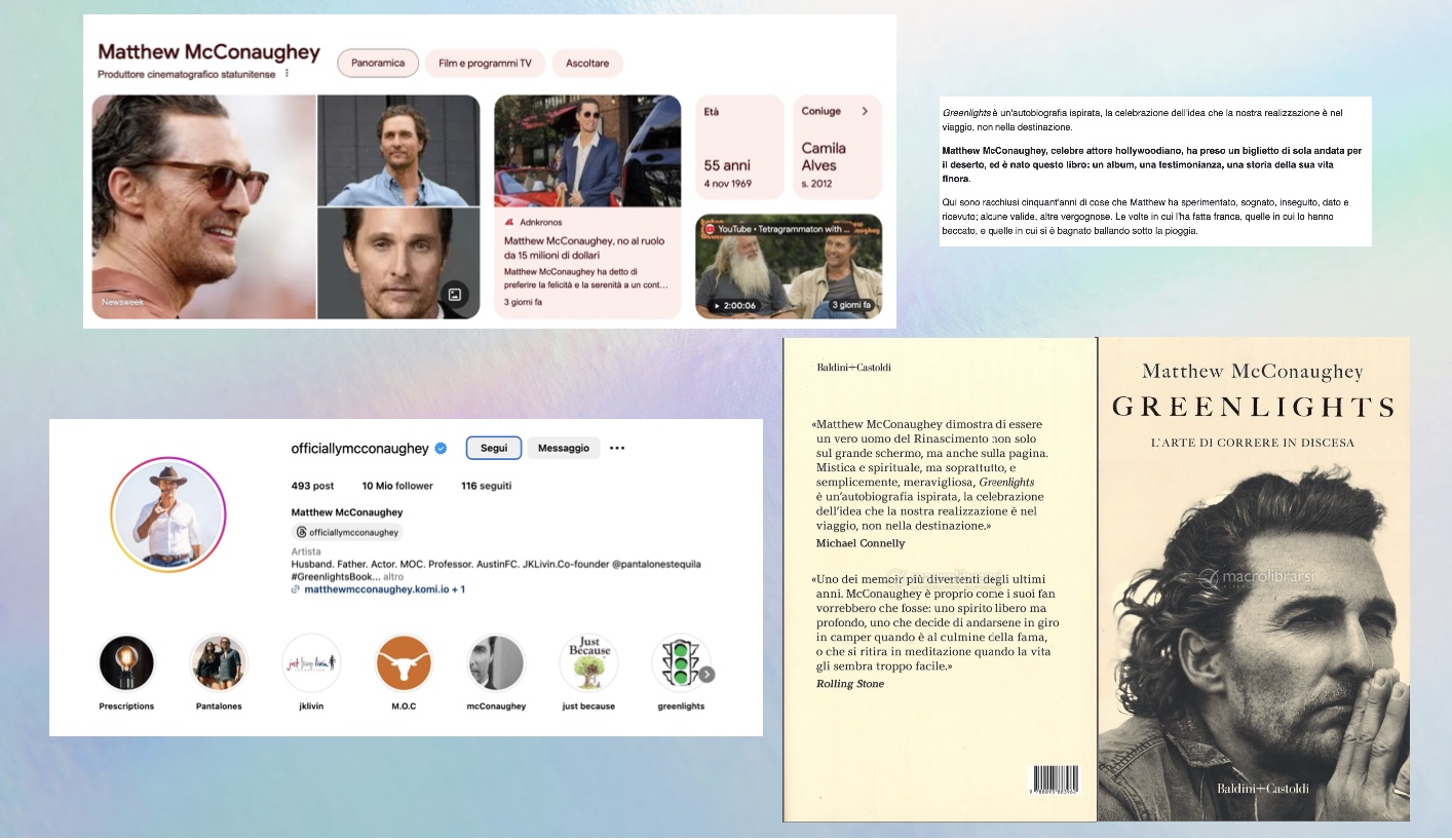 2) le storie sono strumenti di potere, devono trascinare l'ascoltatore nella storia con verità sorprendenti, effetti visivi, approcci insoliti. Esse vanno costruite e realizzate con investimenti importanti…quando si raccontano le storie il pubblico dovrebbe rallentare per ascoltare e la condivisione dovrebbe consentire alle persone di percepire più efficacemente cosa ciascuna storia di marca nel portafoglio ha da raccontare (è un modo per “gestire” la volatilità finanziaria nel corso del tempo). E’ il caso di Matthew McConaughey a partire dal suo libro Greenlights ma anche…attraverso altri strumenti/mezzi che ci portano al prossimo punto…