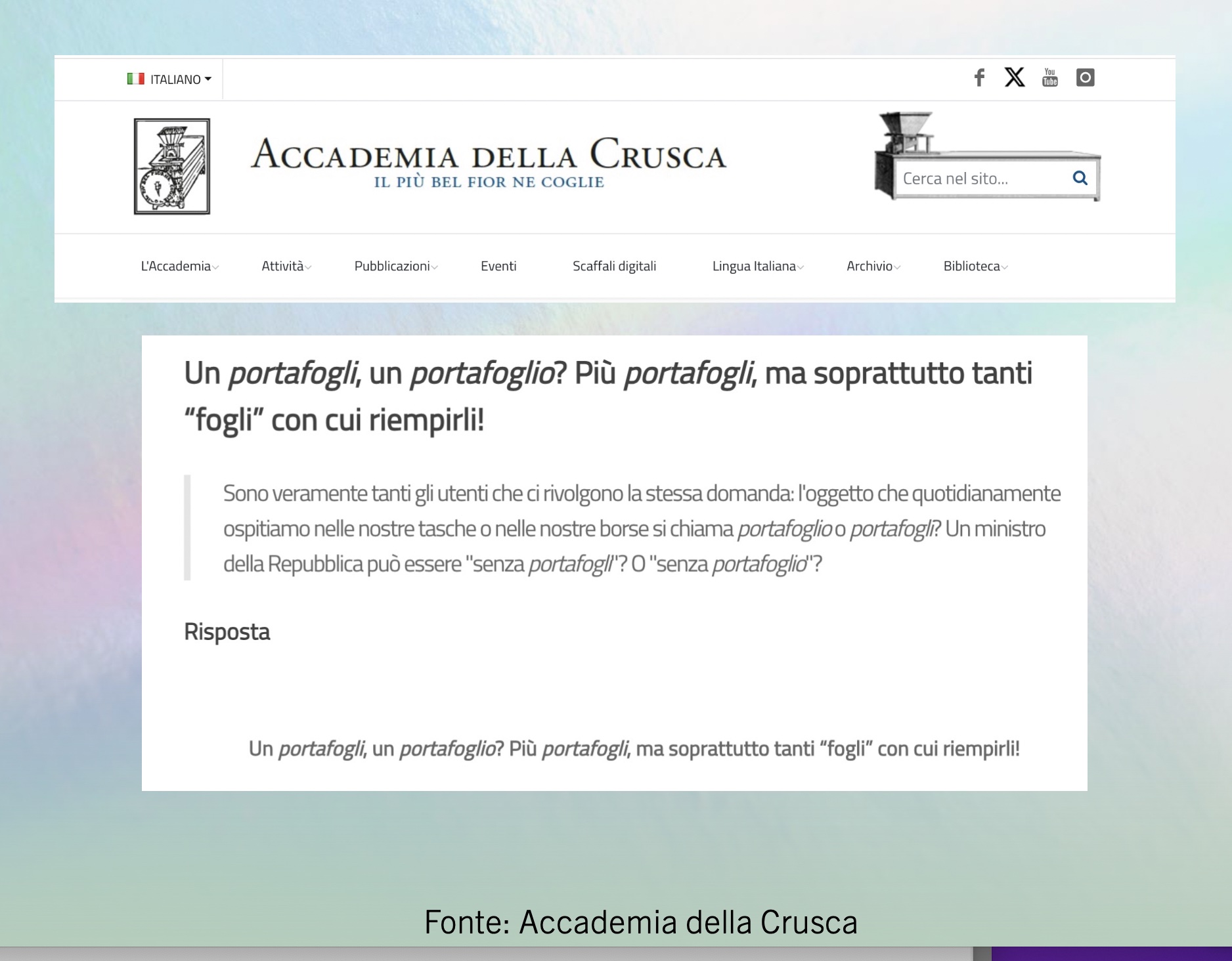 Da un punto di vista lessicografico, Portafoglio o Portafogli ne indica uno con tanti fogli o più di uno? Questa è una delle domande interessanti a cui l'Accademia della Crusca, uno dei principali punti di riferimento - in Italia e nel mondo - per le ricerche sulla lingua italiana, ha fornito una risposta.