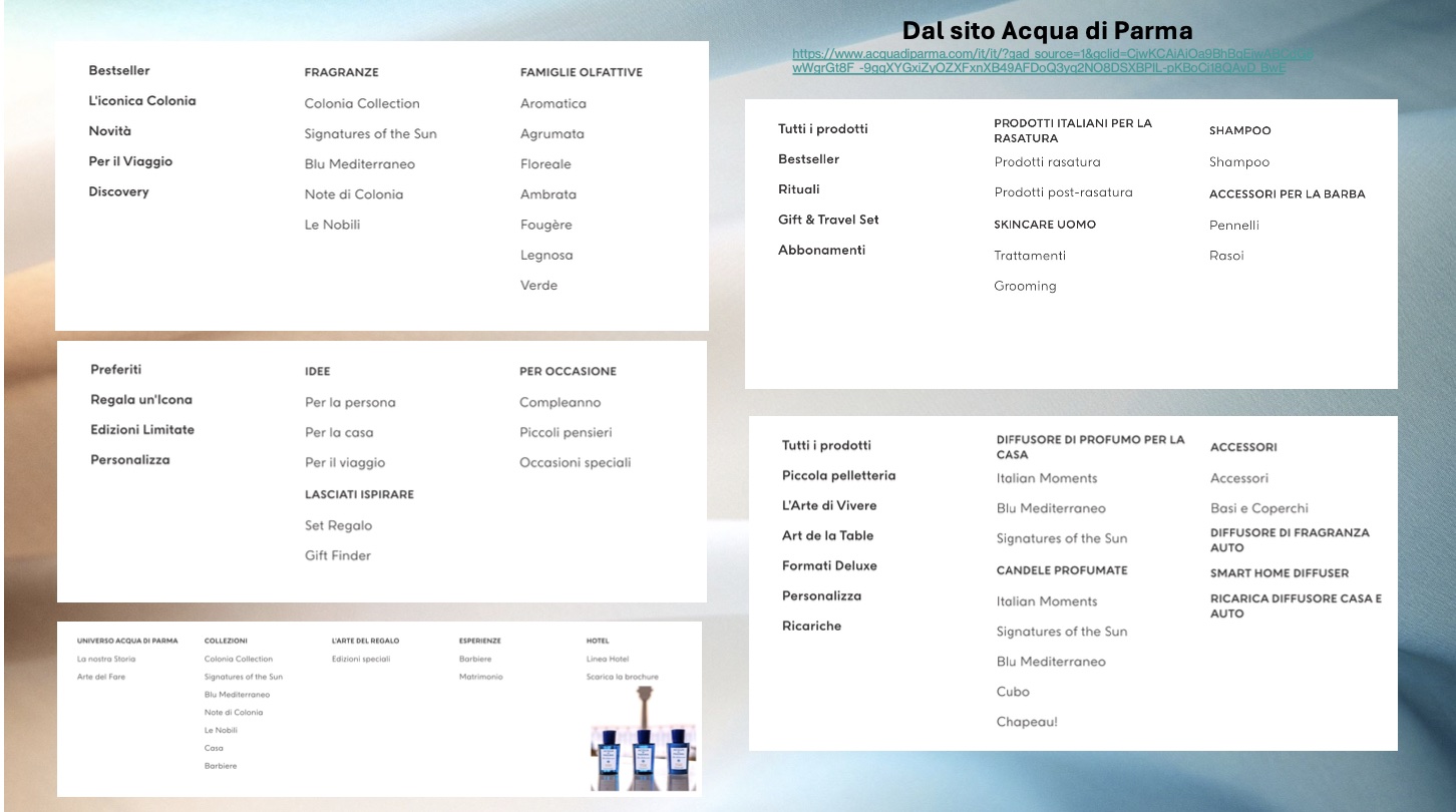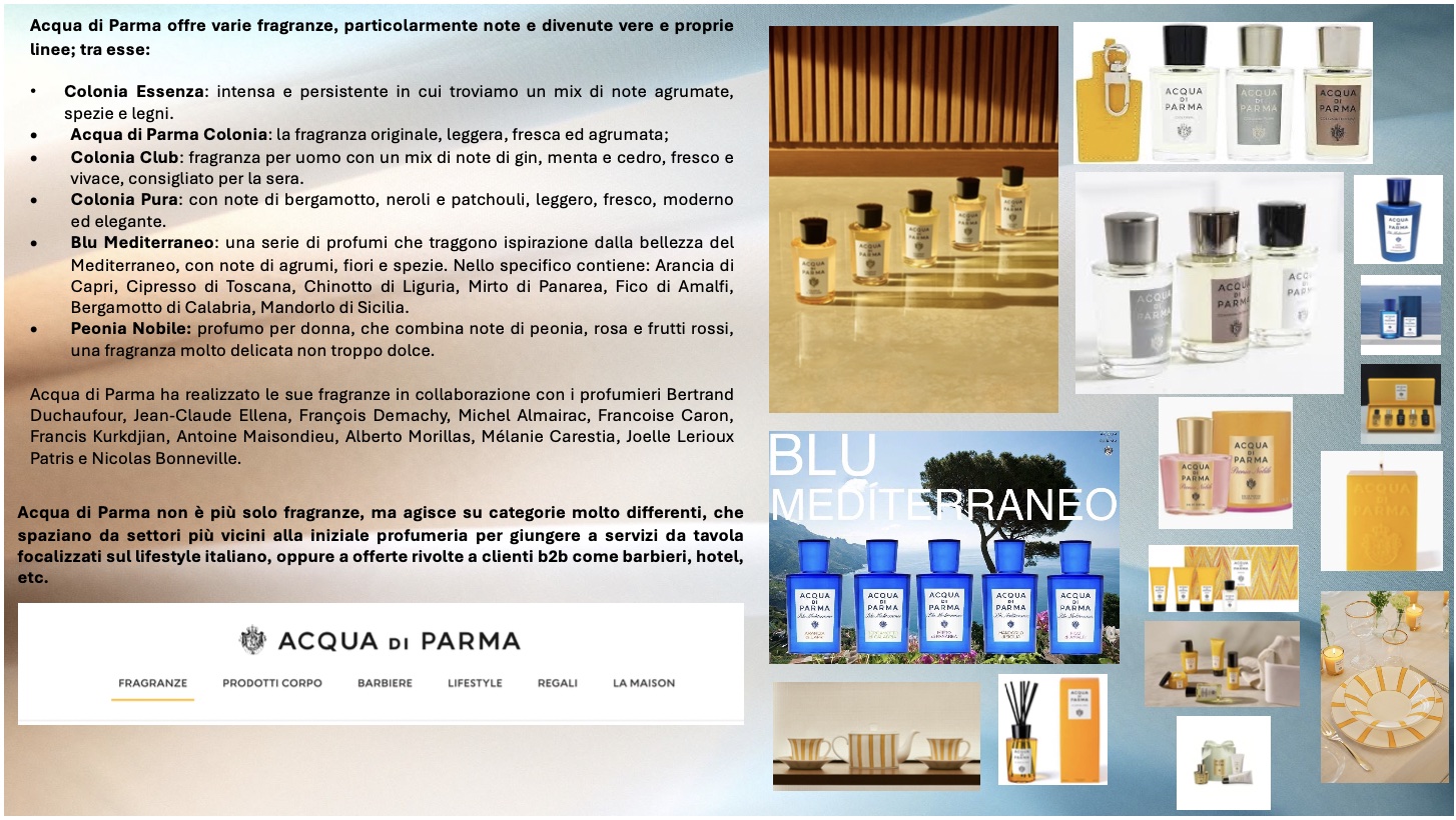 Acqua di Parma ha esteso dunque in numerose altre categorie più “vicine” (candele, diffusori di profumo, prodotti per il bagno, etc.) e via via più lontane dal prodotto-profumo (attraverso il brand streaking con prodotti per la cura della pelle maschile nel 2006, accessori in pelle, cappelliere, etc., indirizzato a: incoraggiare i clienti a prendersi cura della propria persona e della pelle anche fuori dai saloni dedicati attraverso il radersi, l’arte della tavola, il viaggio, etc.), rivolgendosi ai segmento dei “fedeli” (perché i profumi sono profondamente personali; ognuno di noi è particolarmente legato a una fragranza specifica, non appena si trova “quella giusta”, che ci rispecchia, difficilmente la rimpiazziamo con un’altra), e – oggigiorno, sempre più – a consumatori alla ricerca di benefici edonistici o esperienziali o di un appagamento situazionale e/o momentaneo attraverso brand che esprimano valori dell’italian lifestyle. In tal senso, il brand ha dischiuso la presenza su “mercati” (b2c e b2b) e “segmenti di mercato” focalizzati su care, indulgenza, grooming, convivialità, community, etc., aprendosi ad una quotidianità connessa a: rasatura, cura del corpo, viaggi, rituali di bellezza e così via, riscontrabili in luoghi come barber-shop, hotel, spa, e così via.