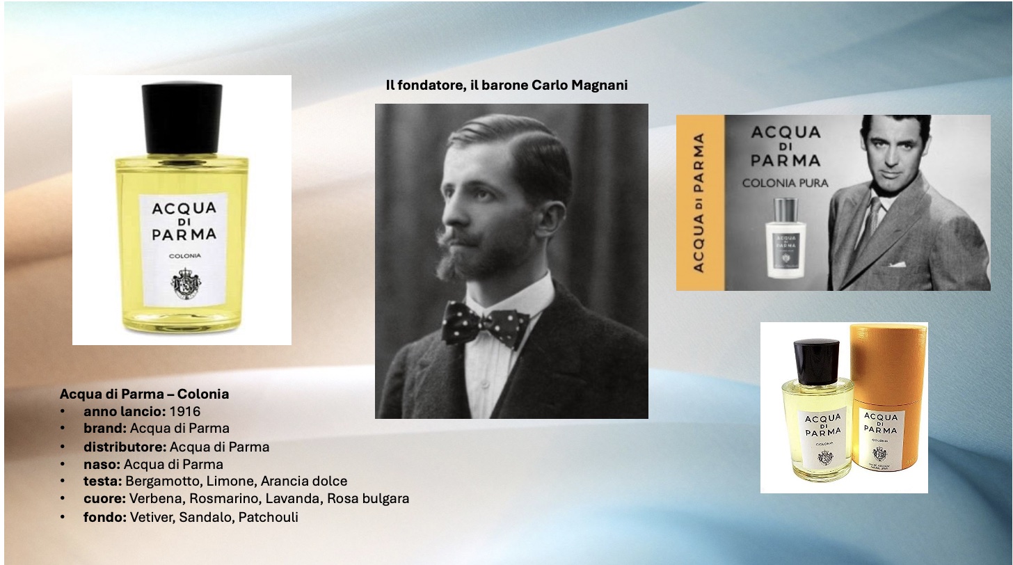 Parma, 1916. Il barone Carlo Magnani, erede di un’aristocratica famiglia parmigiana e nipote dello scenografo prediletto da Verdi, decide di partire alla scoperta delle capitali della moda e della cultura – Londra, New York, Parigi. Questi viaggi lo ispirano e lo guidano nella creazione di una fragranza destinata a diventare un classico: Colonia. L’acqua di colonia, prodotto inventato nella città di Colonia da Giovanni Paolo Feminis (1660-1736 ca), originario del Piemonte ed emigrato poi in Germania, possedeva una bassa gradazione in alcool etilico e una ridotta concentrazione di oli essenziali (3-5%).