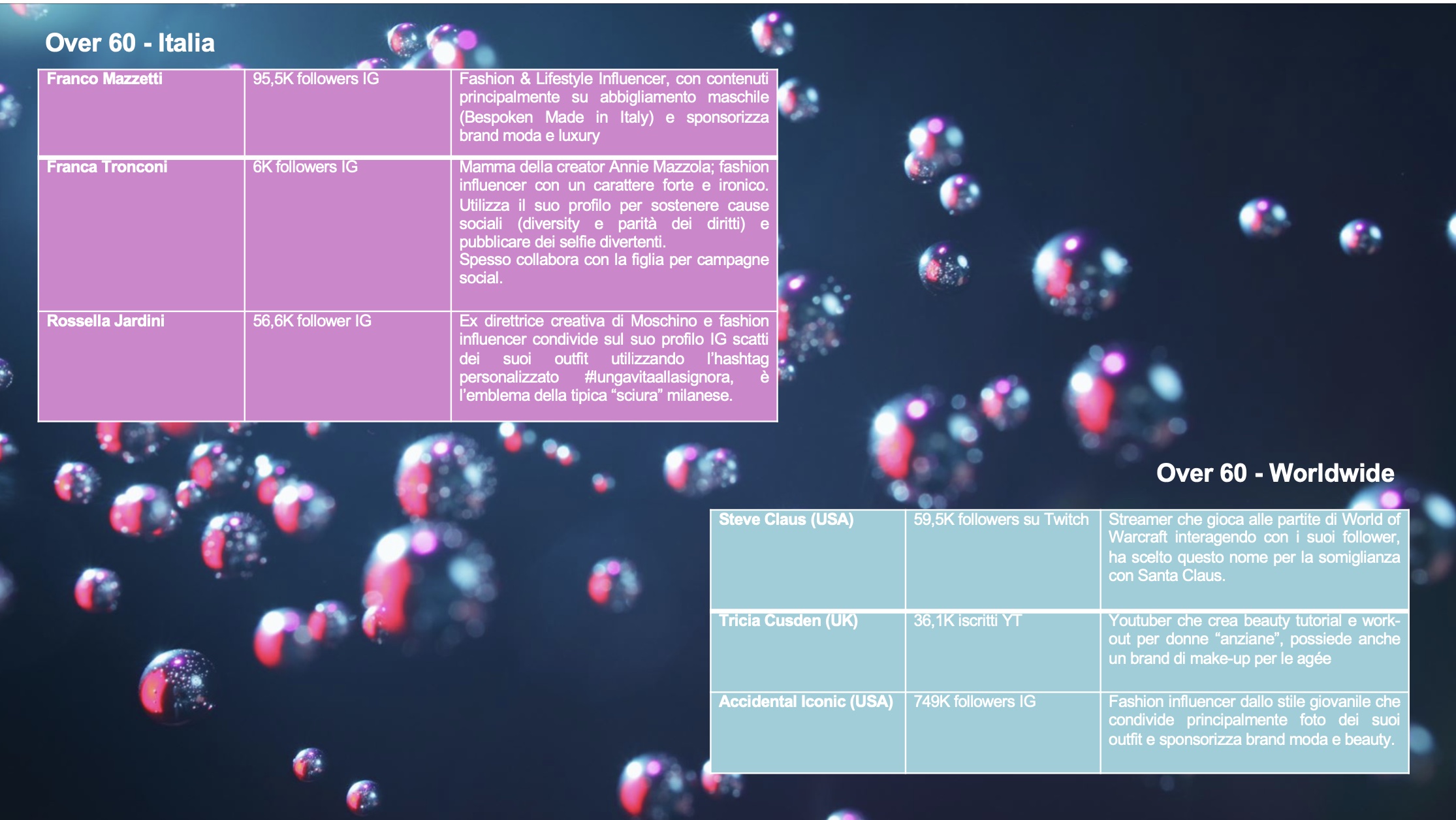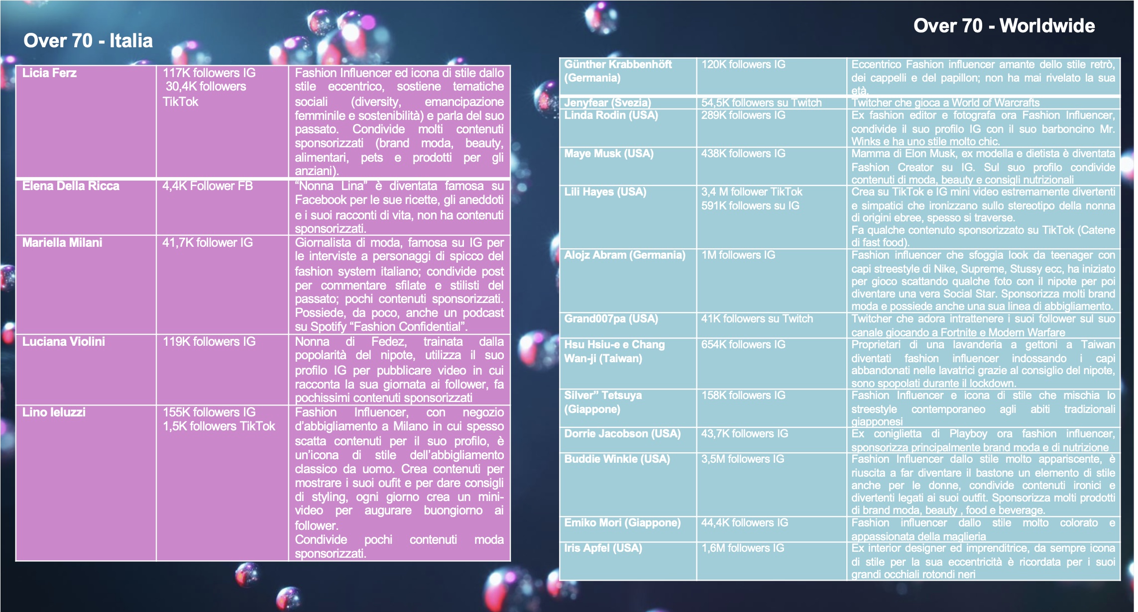 Anche in Italia si è sviluppato il fenomeno degli influencer “più maturi”, certamente conseguenza della mutazione dei pubblici dei social media e, tra questi ultimi, quelli più “frequentati” - ad evidenza anche Instagram, da sempre presentato come il “territorio dei giovani!” – evidenziano una composizione demografica molto diversa rispetto ai loro albori e/o alla progressiva affermazione.