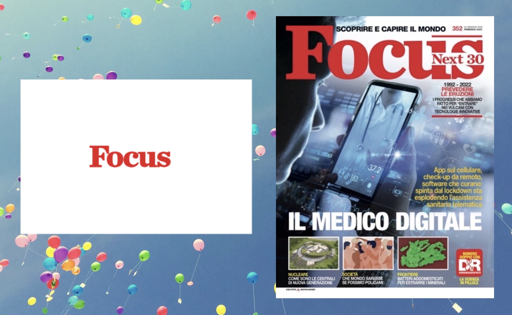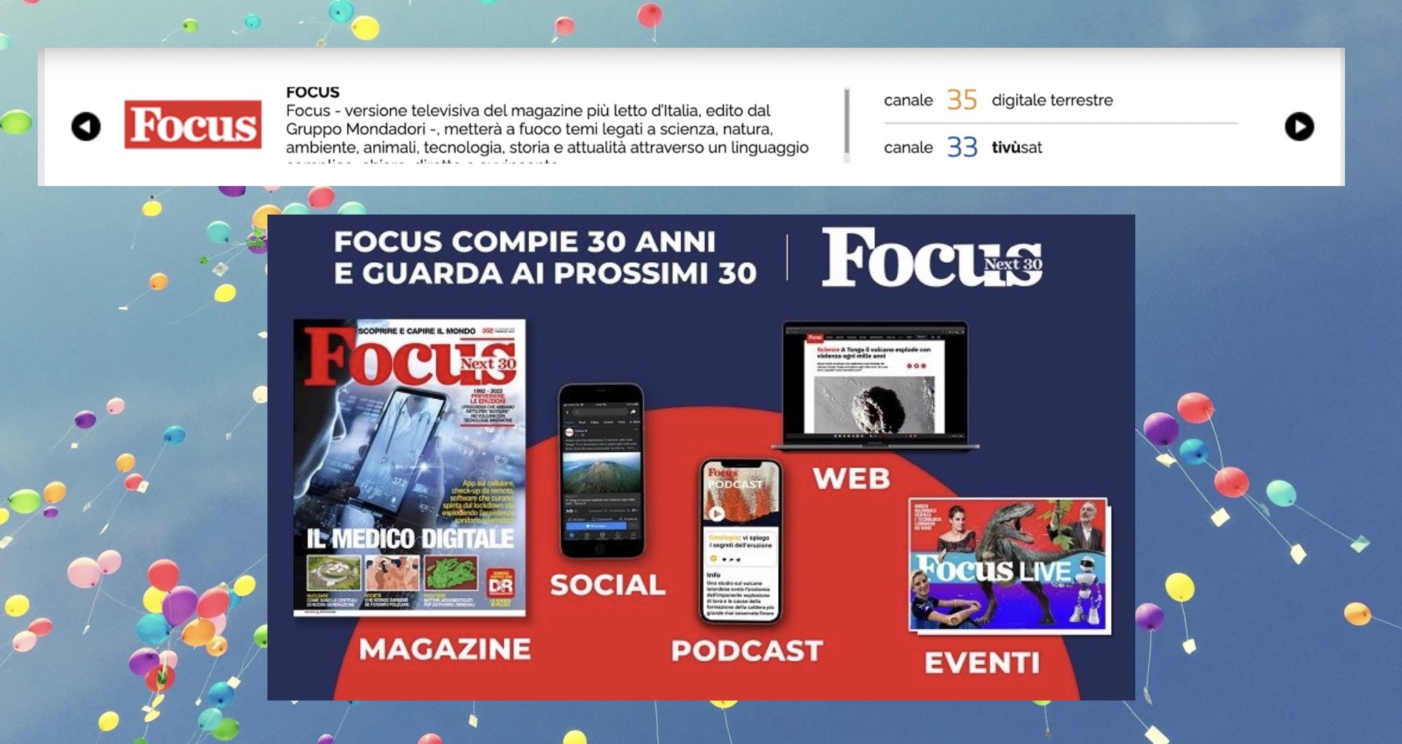 In trent’anni, da semplice magazine Focus è diventato un’autentica piattaforma di divulgazione a 360°, dal sito web dedicato alle diverse testate (Focus.it; Focusjunior.it, ecc.) ai social, dalla tv fino ai podcast, dalle app agli eventi - anche phigital - per far vivere emozionanti esperienze, seguendo la journey di lettori e fruitori nel passaggio trasformativo da piccoli lettori ad abituali fruitori.