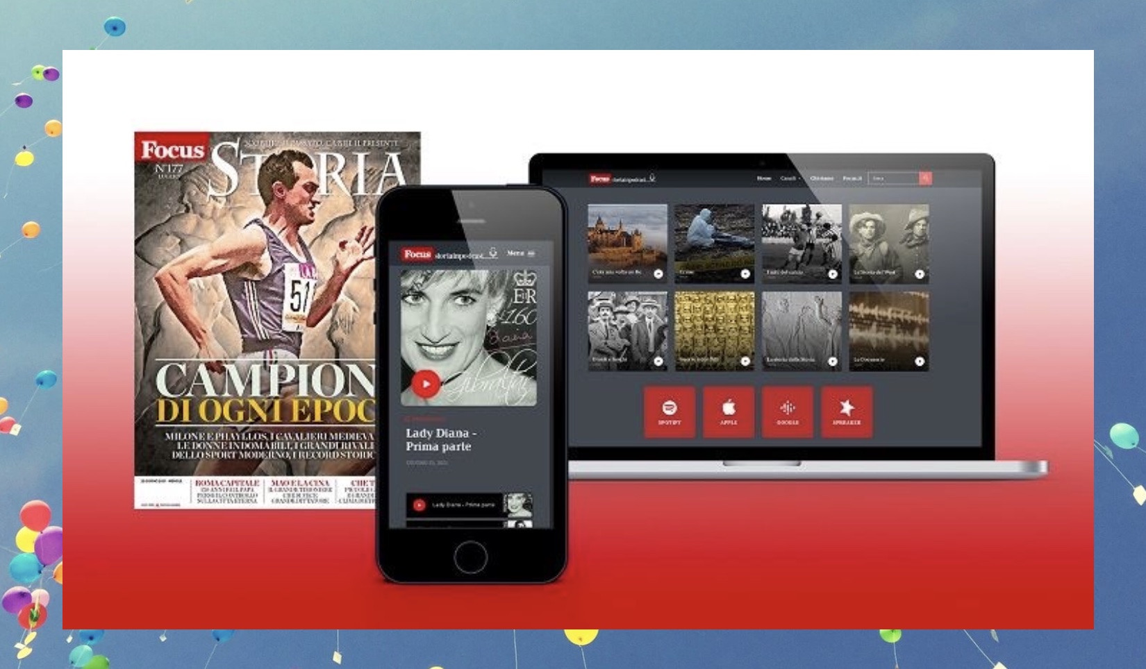 Dal 2021 i contenuti di Focus Storia vengono proposti in nuovi canali e nuovi format (podcast e docuserie) con “Storia in Podcast”, che rappresenta una completa audio library volta alla scoperta di protagonisti e i fatti che hanno segnato la civiltà umana. “Storia in Podcast” viene presentato come un viaggio con oltre 180 episodi in continuo aggiornamento, suddivisi in 10 canali tematici per raccontare le grandi vicende del passato con un taglio semplice ma rigoroso, grazie al contributo di storici e divulgatori contemporanei provenienti dalle principali università italiane. Per arricchire il palinsesto una puntata ha celebrato i 60 anni dalla nascita della Principessa Diana, tanto amata! I contenuti sono disponibili sul sito del brand Focus (con un’audience complessiva di 6 milioni tra lettori e utenti (fonte: Nielsen Data Fusion, novembre 2020) e sulle piattaforme Spotify, Apple Podcast, Google Podcast e Amazon Podcast, dove ha registrato più di 2,2 milioni di download complessivi, ed è nella top 5 di iTunes.