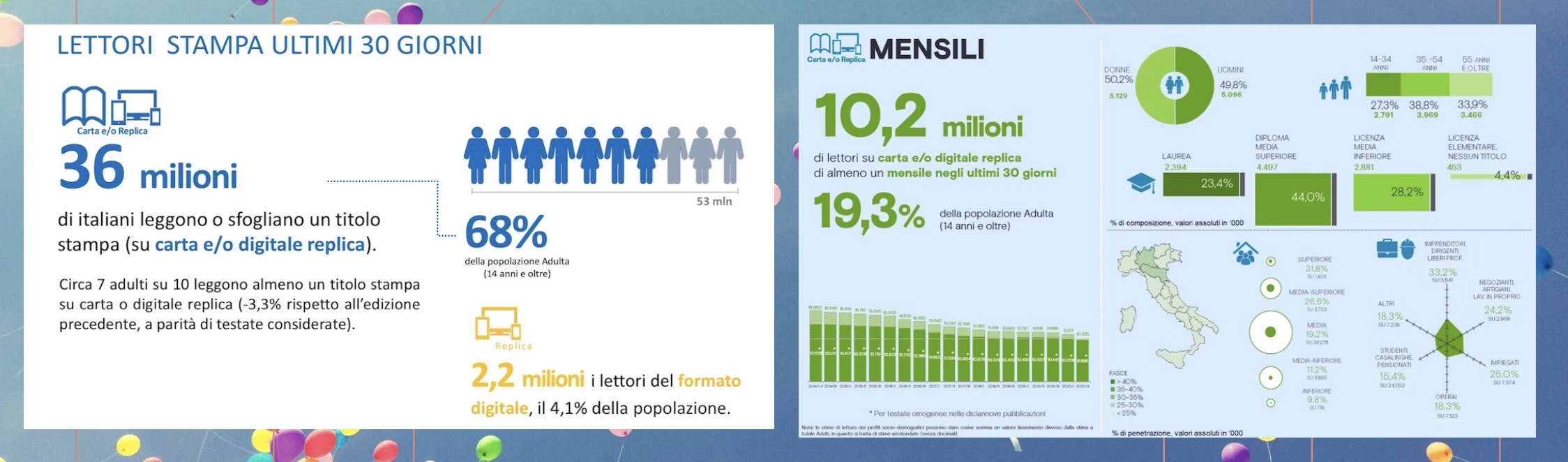 In Italia si evidenzia il perdurare della spinta verso il digitale, con la naturale e particolare accelerazione proveniente dall’anno pandemico. Certo è che nel nostro Paese si legge poco (ma è una storia vecchia!) e i dati Audipress 2020/II – risultato dell’indagine ufficiale per la lettura della stampa quotidiana e periodica in Italia, che monitora in maniera continuativa le abitudini di lettura e la fruizione delle più importanti testate - testimoniano una decisa accelerazione nella lettura delle copie digitali, con incrementi importanti per quotidiani (+23,9%) e periodici (+77,5% per testate omogenee), che ampliano le platee digitali (per sesso, classi di età e classi socioeconomiche). Con letture complessive in calo del 3,3%, la stampa italiana raggiunge comunque ogni mese 36 milioni di lettori - nelle versioni cartacee o digitali - circa 2,2 milioni fruiscono della digital edition, con un incremento del +31,1%. Nel comparto periodici, ogni mese si raggiungono circa 16,5 milioni di lettori per le maggiori testate mensili (sono 10.225.000, pari al 19,3% degli italiani).