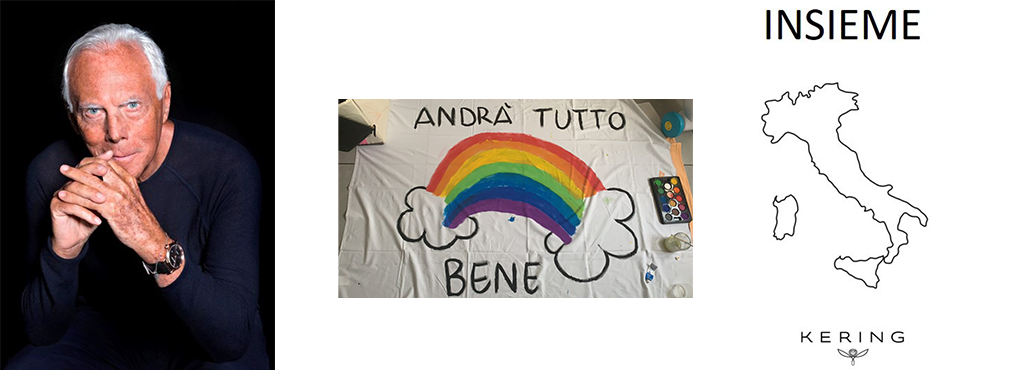 Nel Fashion System: Giorgio Armani ha preso parte attiva alla lotta al coronavirus donando 1 milione e 250 mila euro, per supportare la Protezione Civile e gli ospedali Luigi Sacco, San Raffaele e l’Istituto dei Tumori di Milano e l’Istituto Lazzaro Spallanzani di Roma. Bulgari, si è impegnato affinché l’Istituto Nazionale per le Malattie Infettive di Roma si dotasse di un sistema microscopico di acquisizione delle immagini all’avanguardia. Il gruppo Kering, di cui fa parte Gucci, effettuerà una donazione di due milioni di euro ad alcune principali fondazioni e strutture sanitarie in Italia, per sostenere gli sforzi per i servizi in ambito sanitario.